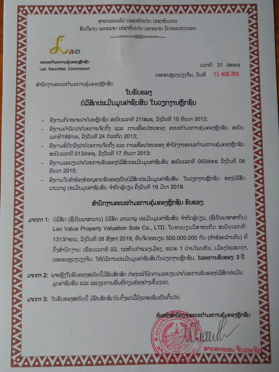 LSC-Lao Security Commission Committee Approval, Bank of Lao PDR